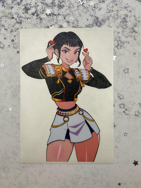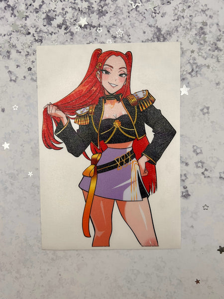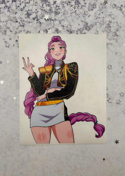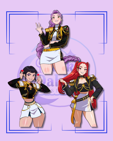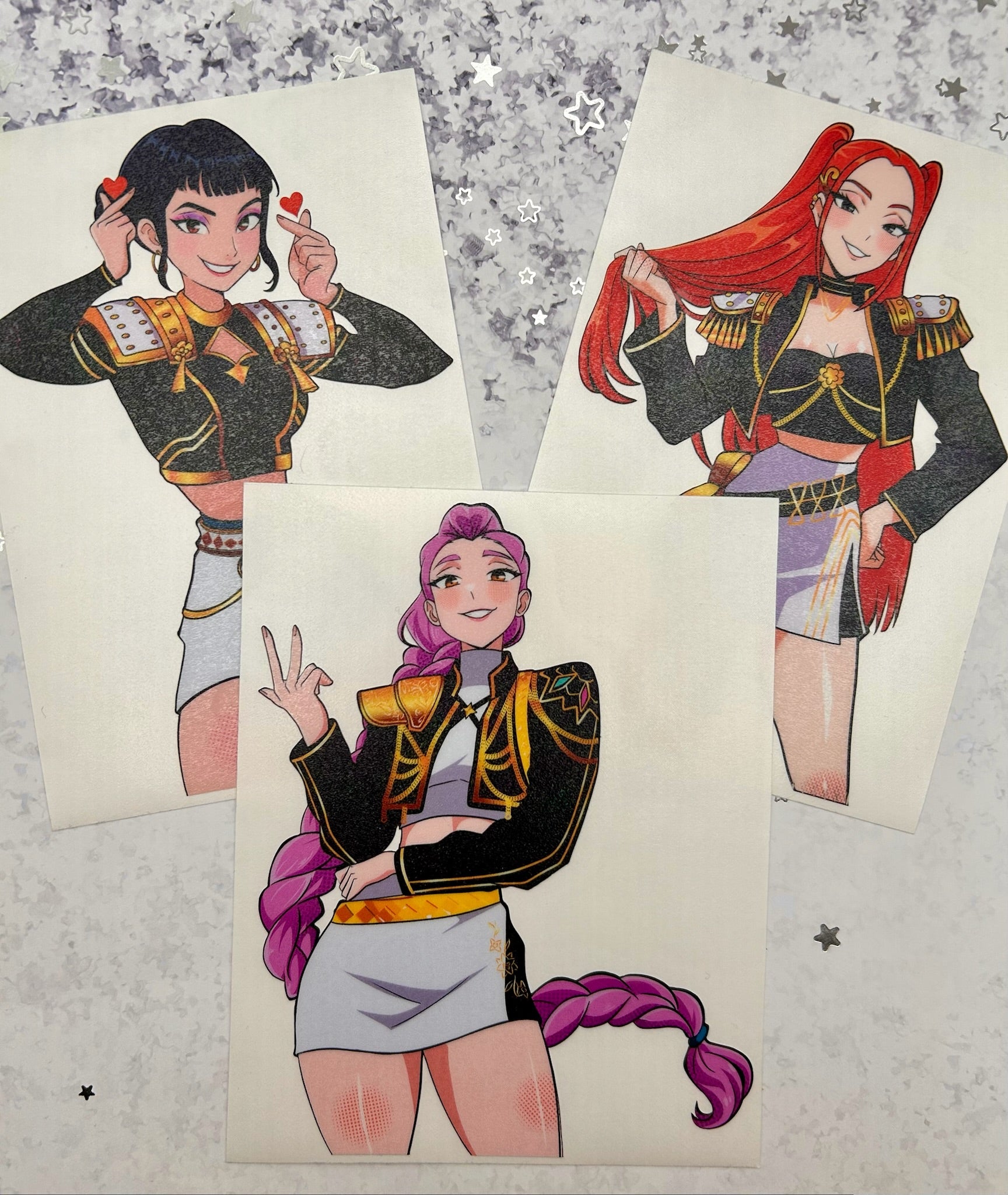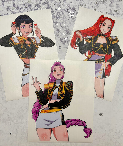 Show off your love for demon hunting with these playful stickers featuring Mira, Zoey, and Rumi in their shiny Golden outfits! These durable stickers are perfect for decorating your gear, laptop, or water bottle while keeping the demon-fighting spirit alive in any weather. Add a bit of magic and fun to your everyday items!