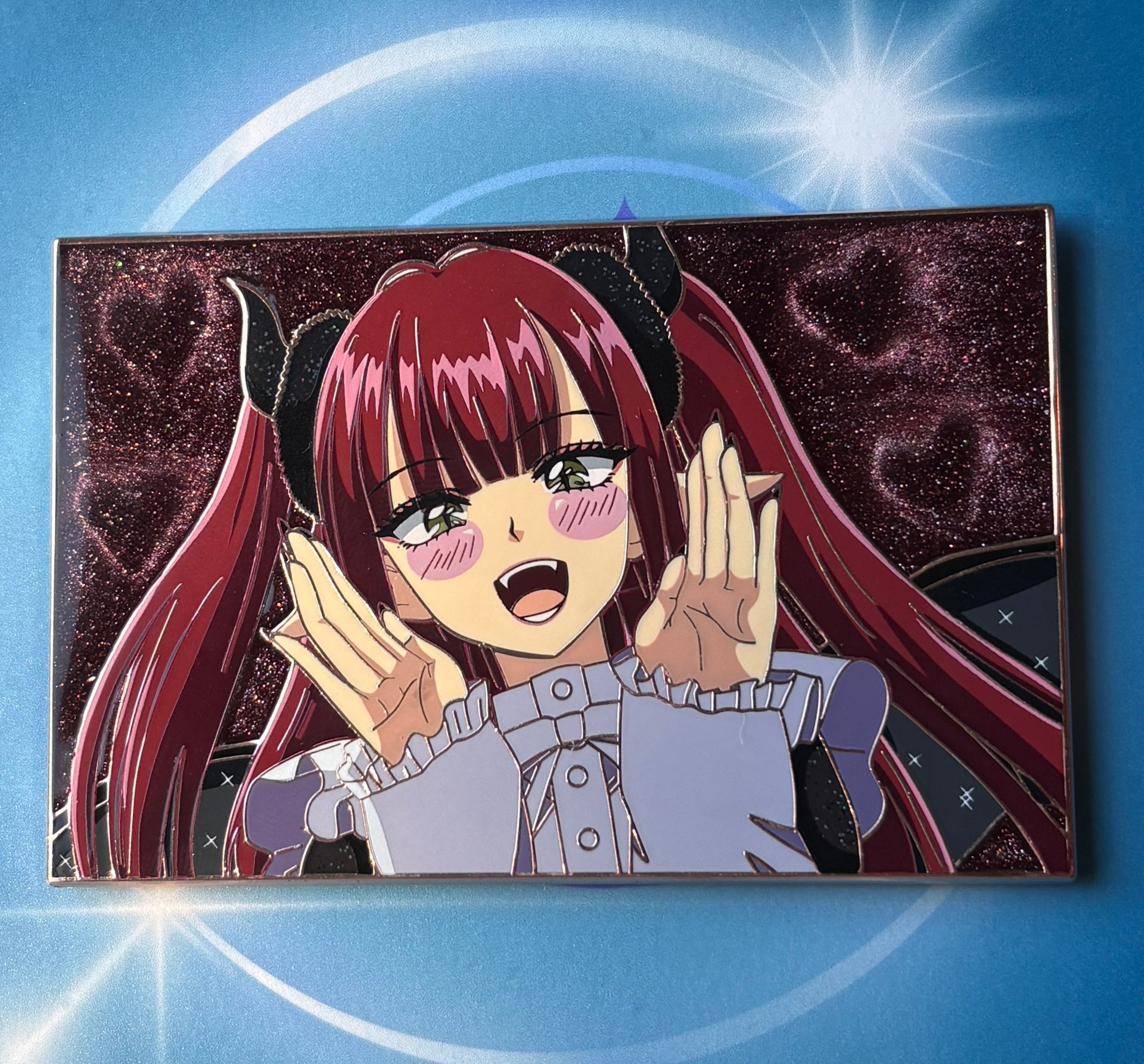 Specs: 3in across, rose gold plating, cateye background, glitter effect